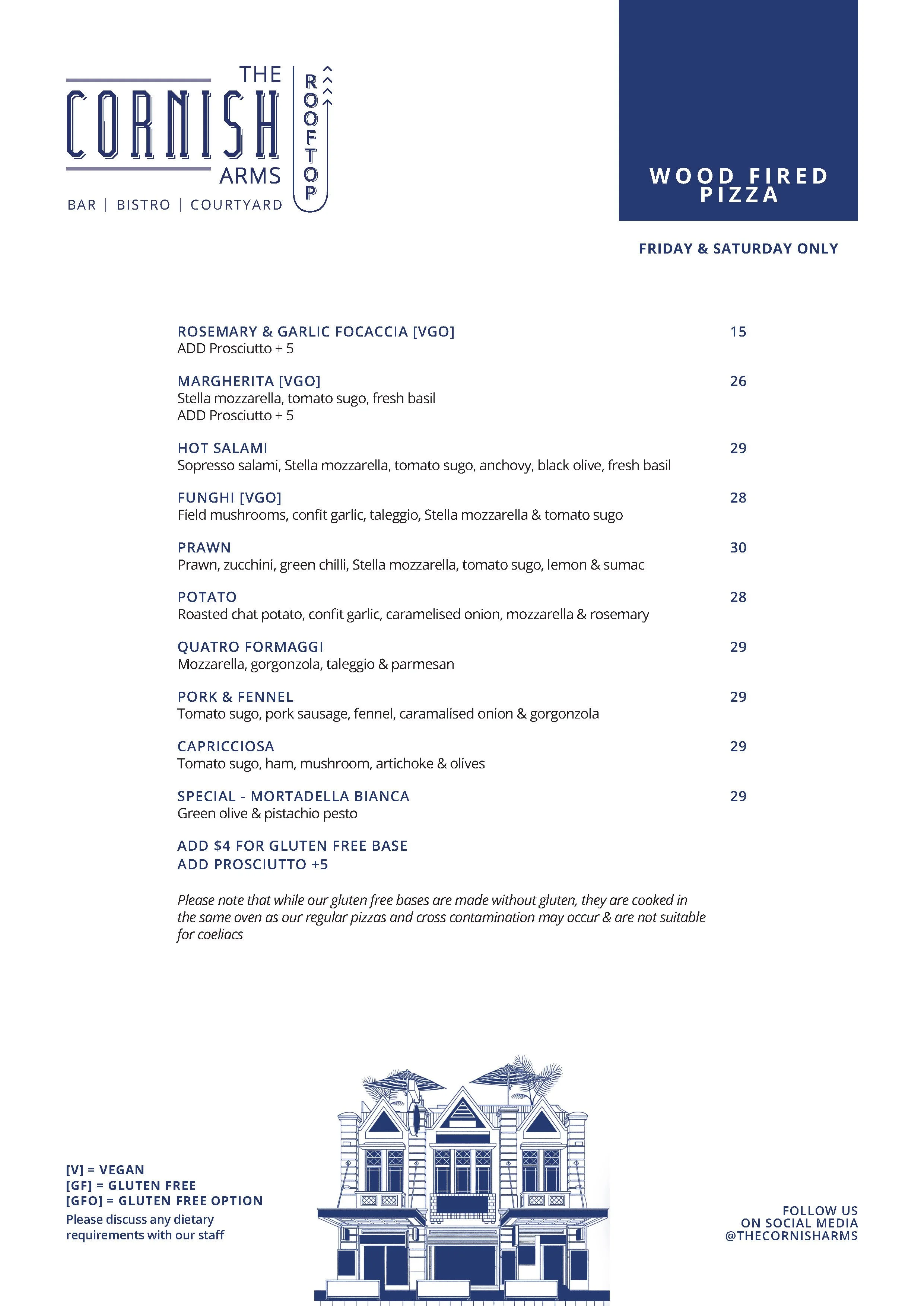 The Rooftop Snack and Pizza Menu - Fridays and Saturdays 12pm - 9.30pm.